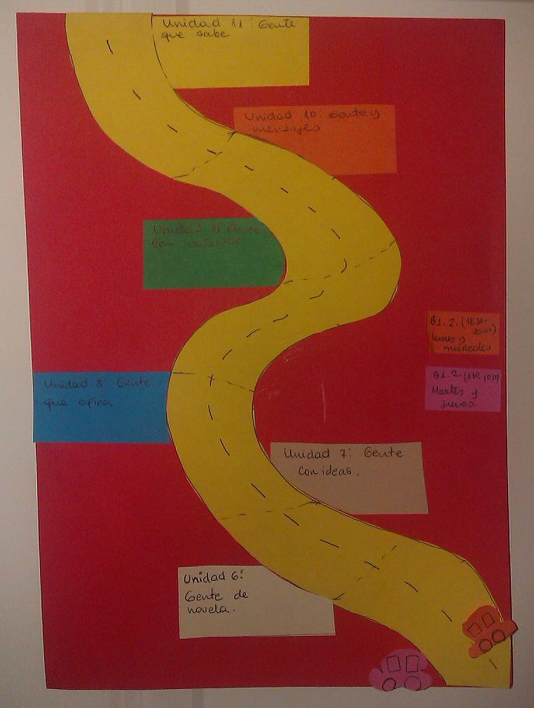 Fíjense ustedes, por ejemplo, que aunque yo tenga muy claro lo que voy a hacer en un semestre, se me bloquean las neuronas en febrero -el invierno está en su peor momento, el sol semanas sin dar la cara y el frío no acaba, la gente tiene las energías por el piso, incluyéndome, y el final del semestre, que es en mayo, no se avista- y, aunque en enero empiezo muy fresquita y organizadita, en algún momento misterioso del camino me apagan la luz. Así, este semestre he decidido usar los colores y mis manos (soy muy visual y kinestésica) para visualizar claramente nuestro punto en el camino. Le pido a los estudiantes que muevan el carrito que simboliza nuestro avance por la ruta del curso y, así, entre varias cabezas me ayudan a mi a recordar por dónde les debo guiar y saben ellos a dónde vamos todos en ese carro metidos. Eso es programar, aunque no siempre tenga clara la duración de una actividad, sino una sospecha basada en la experiencia, y aunque un día descubra que hay un evento en la calle de atrás que vale más que todos vayamos a ver en lugar de leernos el súper texto que preparé para ellos.