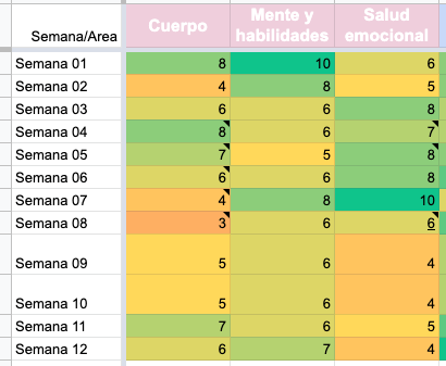At home we have the habit of setting goals for the year. They are pretty much OKRs that we keep in a google sheet and divide by quarters and months, and that are organized by areas of importance in our lives. We also keep a sheet where we track our satisfaction with these areas on a weekly basis (we pretty much do weekly retrospectives :)). The areas include things like physical health, family relationships, work, home, mental health, and so on.