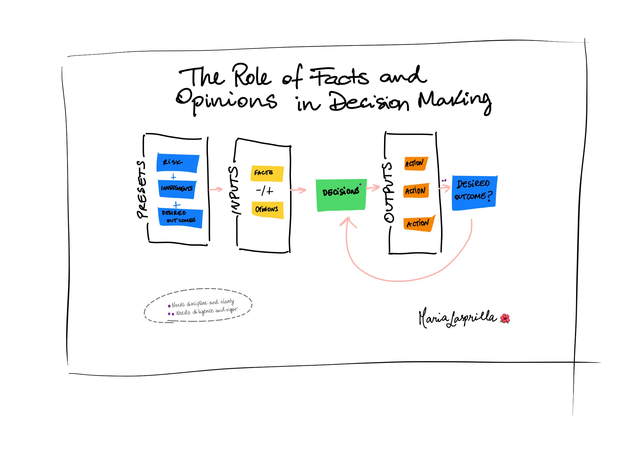 In the end, how you proceed with your decisions should not change whether you start your journey from facts or opinions, as long as you have the discipline to make clear decisions and apply the diligence to record and analyze the results of those decisions, you can get to where you want more effectively. If, on the other hand, you have amazing facts, make a decision, but do not monitor the results to fundament your next steps, you will be ineffective, anyway. Decisions are usually not conducive to an end result, but rather to the starting point of a new decision to be made.