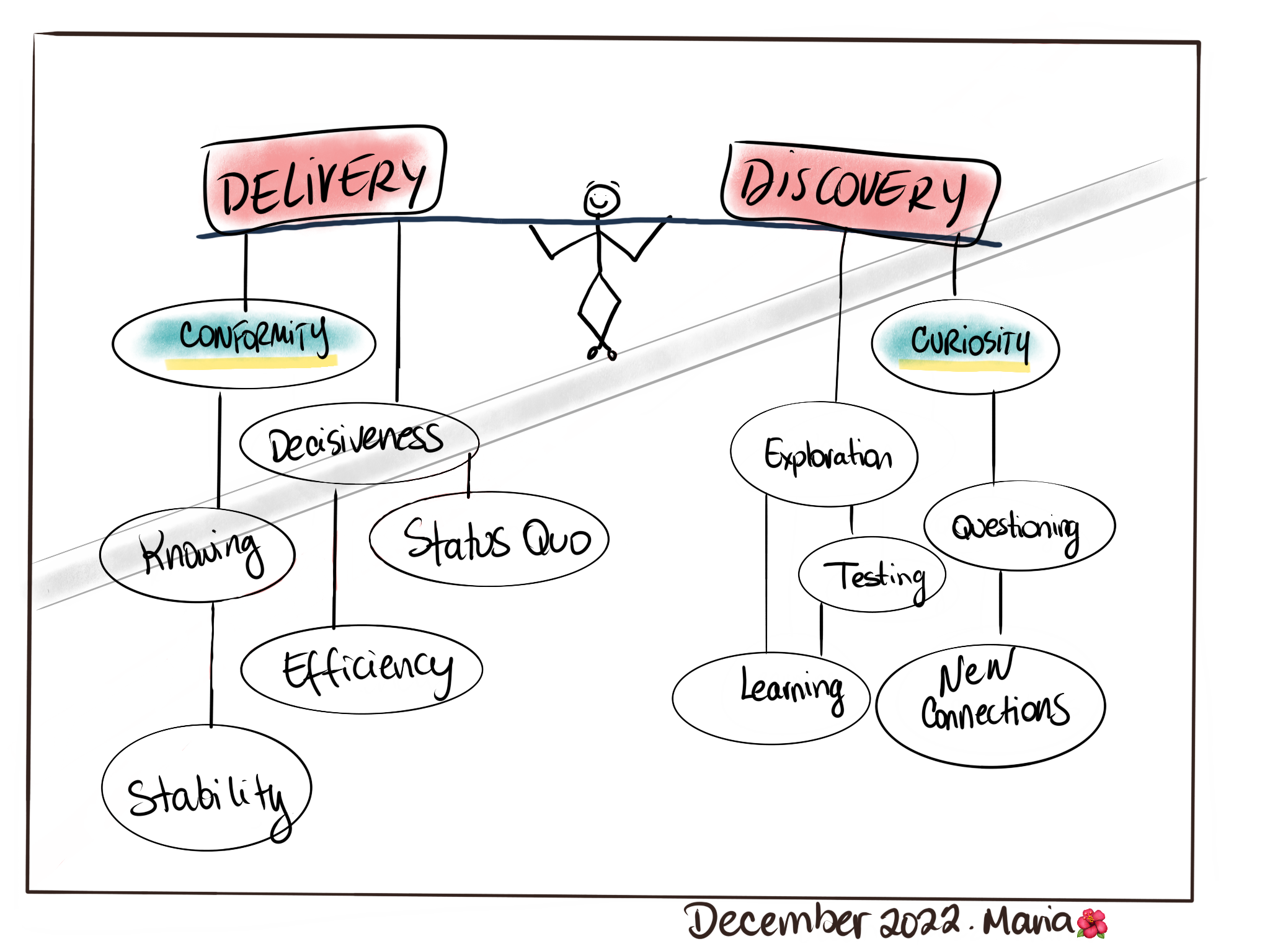 This also got me thinking about the balance between being curious and being efficient. When we want to bring a solution into production we will have tons of questions about the feasibility, viability and desirability of it. But we have to address only the most critical questions around these three areas of uncertainty, else we risk never getting things done. Being explorative without constraints can work well if one is working in a purely academic context, but in the business world where achieving goals is necessary for sustainability, and with markets constantly and quickly changing, we need to limit the amount and type of questions we work with in the benefit of making timely decisions that result in actual business outcomes.